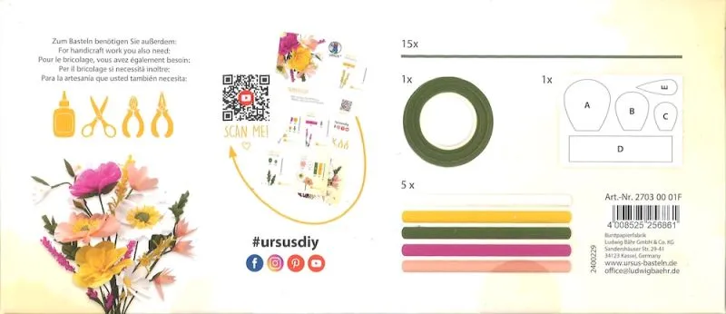 Inhalt: • 5 Rollen Floristenkrepp, 25 x 75 cm, sortiert in 5 Farben • 1 Schablonen-Stanzbogen • 1 Rolle Floristen-Klebeband 12 mm x 27 m • 15 Drähte, 25 cm lang • inklusive Anleitungsvideo (QR-Code)
