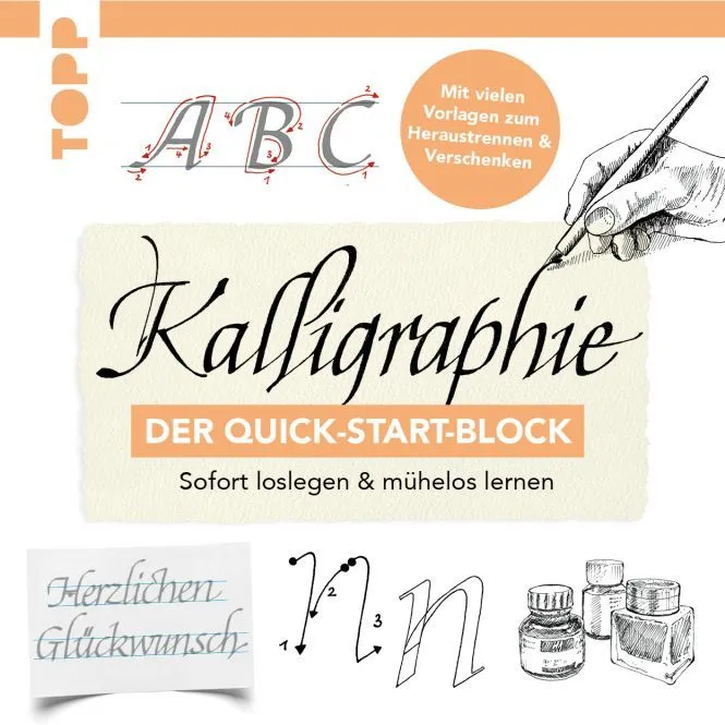 Learning by doing! Dieser praktische Mitmachblock macht den Einstieg in die Kalligraphie ganz einfach. Erste Alphabete und Übungen können direkt in dem Buch ausprobiert und auf den enthaltenen Karten, Anhängern und Postkarten umgesetzt werden. Die wichtigsten Grundltechniken des schönen Schreibens werden so Schritt für Schritt erworben. Erklärungen zu verschiedenen Aspekten der Schrift- und Buchstabengestaltung wie Ober- und Unterlängen, Buchstabenabstände sowie zahlreiche Gestaltungsmöglichkeiten in Farbe und im Layout machen den Quick-Start-Block Kalligraphie zu einem praxisnahen Grundlagenwerk für jeden, der auf sehr kreatives Weise das Kalligraphieren kennenlernen möchte.Informationen zur Produktsicherheit