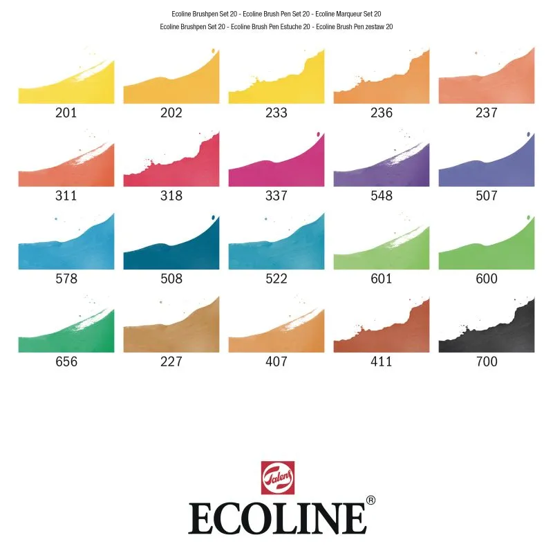 Inhalt: 20 Brush Pens (201 Hellgelb - 202 Dunkelgelb - 233 Chartreuse - 236 Hellorange - 311 Zinnober - 318 Karmin - 337 Magenta - 548 Blauviolett - 507 Ultramarinviolett - 578 Himmelblau (Zyan) - 508 Preussischblau - 522 Türkisblau - 601 Hellgrün - 600 Grün - 656 Waldgrün - 227 Gelber Ocker - 407 Dunkler Ocker - 411 Siena gebrannt - 700 Schwarz - 902 Blender).