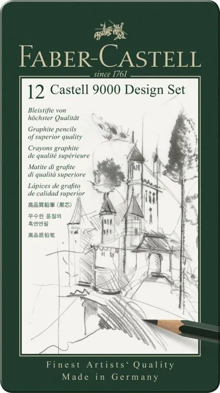Das Design Set enthält 12 CASTELL 9000 Bleistifte in den Härtegraden 5B - 5H Ideal geeignet für Zeichnungen im Bereich Industrie-Design oder feinste Detailzeichnungen Umweltverträglicher Wasserlack Extra bruchgeschützt durch Spezialverleimung (SV)