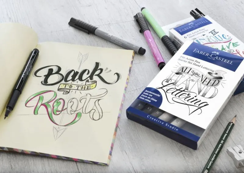 Alles, was man für Handlettering braucht: Ein Bleistift für Vorzeichnungen, Pitt Artist Pen Fineliner für Konturen, feine Details und Verzierungen sowie Pitt Artist Pens mit Pinselspitze für Schriftzüge, Schwünge und Fill-in´s