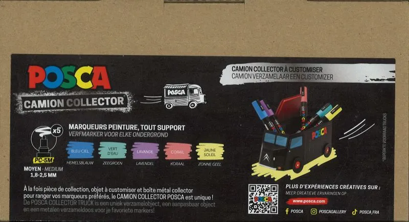 Bei diesem Artikel handelt es sich um ein Set in limitierter Auflage mit 5 Posca PC-5M-Markern, kombiniert mit einem einzigartigen Stifthalter aus Metall in Form eines Citroën-Trucks. Dieses Set ist als Sammlerstück und funktionales Kreativ-Toolkit konzipiert.