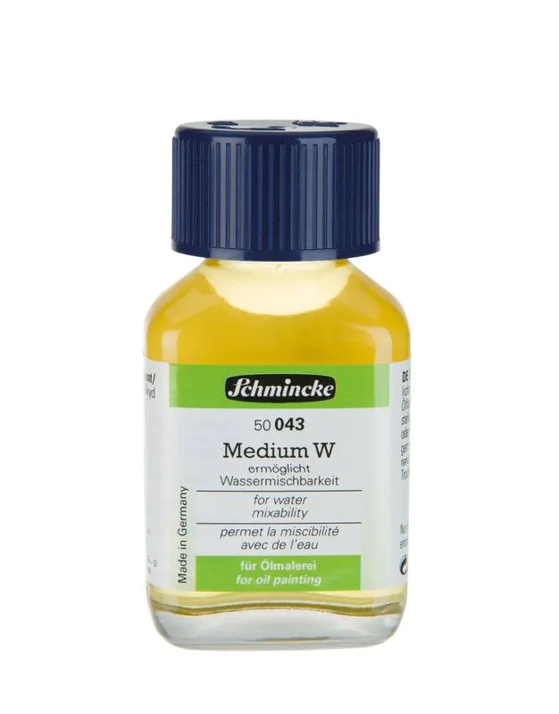 Flüssiges ("mageres") Malmittel zum Verarbeiten von Ölfarben mit Wasser anstelle von organischen Lösungsmitteln wie z.B. Terpentinöl oder Terpentinersatz. Steigert Glanz und Transparenz, senkt die Viskosität, harmonisiert die Trocknung und ist geruchsarm. Vor Gebrauch schütteln. 2 Anteile Ölfarbe mit 1 Anteil Medium W auf einer Palette vormischen, dann ggf. Wasser hinzugeben. Bei Bedarf weiteres Medium W hinzugeben. Malgeräte können mit Wasser gereinigt werden. Es besteht keine Beeinträchtigung der Produktqualität bei Farbtonschwankungen durch den Rohstoff Alkydharz. Dosierung: 50%