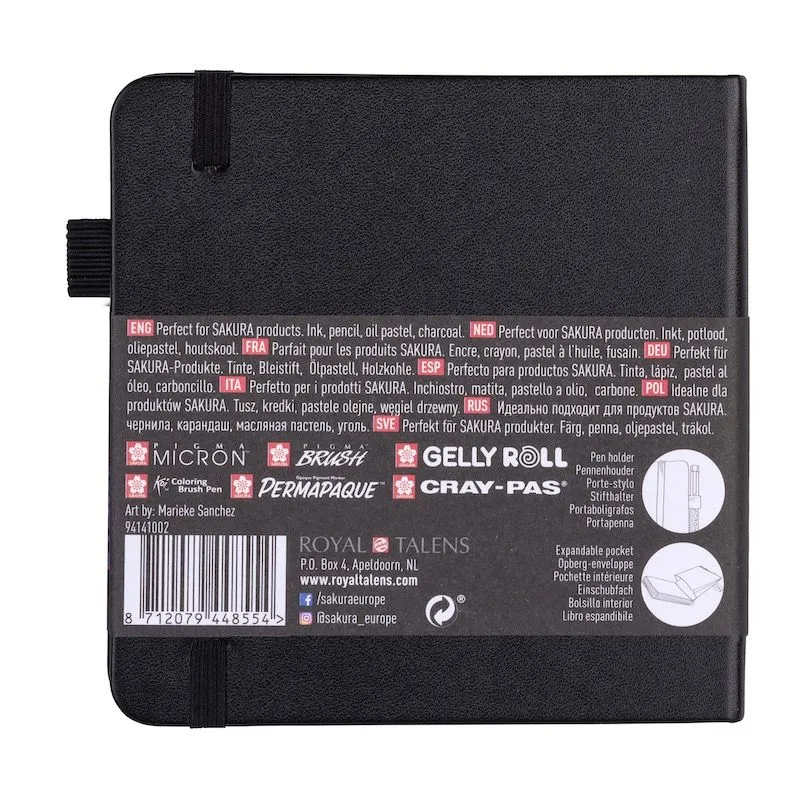 Das Skizzen- und Notizbuch von Sakura bietet, mit einer Größe von 12x12 cm und 80 schwarzen Blättern aus säurefreiem, 140 g/m2 starkem Papier, Platz für alle Ihre Kunstwerke, die Sie mit Tinte, Buntstiften, Ölpastellfarben oder Holzkohlebleistiften kreiert haben. Die exklusiv illustrierte Schutzhülle kann als Lesezeichen verwendet werden. Kunstwerk von: Marieke Sanchez. Das Buch mit Festeinband hat einen Stifthalter mit einer perfekten Größe für Stifte wie den Pigma Micron oder den Sakura Gelly Roll. Hinten im Skizzen- und Notizbuch bietet ein aufklappbarer Umschlag zusätzlichen Platz für Skizzen und Notizen. Der elastische Gummibandverschluss gewährleistet, dass das Buch auf Reisen geschlossen bleibt und kompakt verstaut werden kann. Die Skizzen- und Notizbücher von Sakura sind perfekt zum Skizzieren und Schreiben mit Sakura-Produkten: Pigma Micron, Pigma Brush, Koi Colouring Brush Stift, Gelly Roll, Permapaque und Original Cray-Pas. Die Skizzen- und Notizbücher von Sakura sind mit cremeweißen oder schwarzen Blättern und in verschiedenen Größen erhältlich.