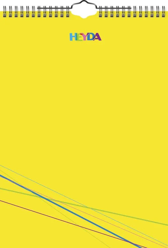 - Deckblatt: gelb, Monatsblätter: farbig (grün, blau, rot, gelb)